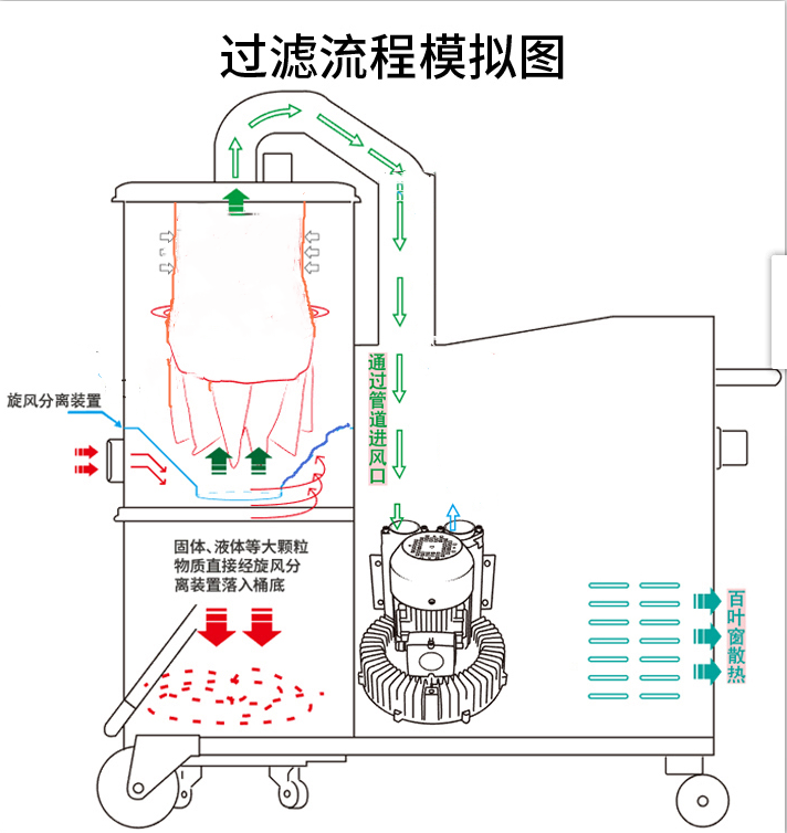 ⑥ 吸鐵屑用大功率工業(yè)吸塵器動力系統(tǒng)為保證設(shè)備的高壓動力、持續(xù)續(xù)航。風(fēng)機(jī)方面采用國際先進(jìn)的精鑄渦輪風(fēng)泵,.此款風(fēng)泵采用了風(fēng)冷式雙旁路(Bypass)的散熱系統(tǒng),這樣的設(shè)計可以讓電機(jī)和風(fēng)泵在使用過程中一直保持恒 溫狀態(tài),使電機(jī)可連續(xù)工作24小時。 風(fēng)泵進(jìn)、出風(fēng)口處安裝有多頻消音器,讓您有一個安靜的工作環(huán)境。電機(jī)采用國產(chǎn)西門子電機(jī),寬壓雙頻(50/60Hz),高可靠、低噪音、長壽命。
